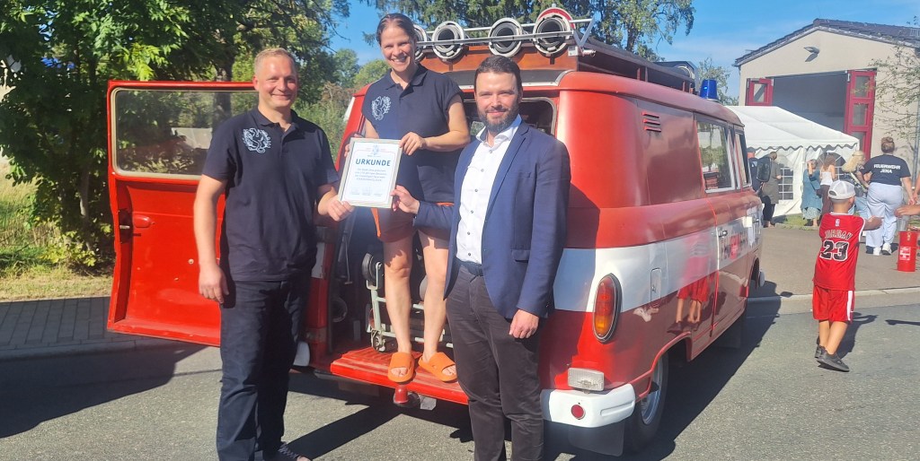 Die Freiwillige Feuerwehr Vierzehnheiligen beging am Samstag, 20. September, ihr 170-jähriges Bestehen mit einer Feierstunde im Ort. Bürgermeister und Dezernent Benjamin Koppe überreichte die Jubiläumsurkunde und würdigte in seiner Ansprache die herausragende Rolle der Wehr: „170 Jahre Freiwillige Feuerwehr in Jena sind eine besondere Leistung – unterstützt von den Freiwilligen Feuerwehren aus Zwätzen, Jena-Mitte, Lützeroda und Lichtenhain. Das zeigt, wie stark die kameradschaftliche Verbundenheit zwischen den Ortsteilen ist und wie gut das Miteinander funktioniert. Genau dieses Zusammenwirken bildet die Grundlage für erfolgreiche Einsätze und sichert die Einsatzbereitschaft insgesamt. Besonders deutlich wurde dies beim letzten großen Brand in Gösselsdorf: Der enge Zusammenhalt und die hervorragende Zusammenarbeit von Berufs- und Freiwilliger Feuerwehr haben gezeigt, wie wertvoll diese Gemeinschaft ist. Dafür danke ich im Namen der Stadt Jena herzlich allen Beteiligten.“