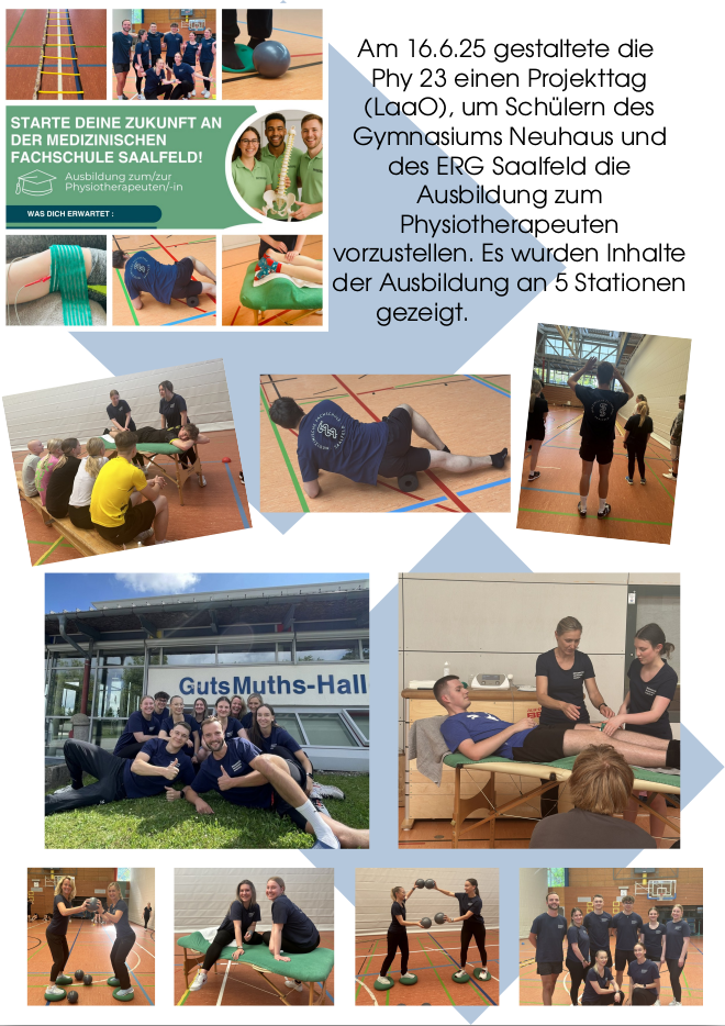 Am Standort in Saalfeld in der Pfortenstraße 42a werden die Ausbildungsberufe aus dem Pflege- und Gesundheitsbereich vorgestellt. Ausbildungsberufe sind Physiotherapeuten, Ergotherapeuten, Masseure und medizinische Bademeister, Pflegefachkräfte, Gesundheits- und Krankenpflegehelfer sowie Altenpflegehelfer.