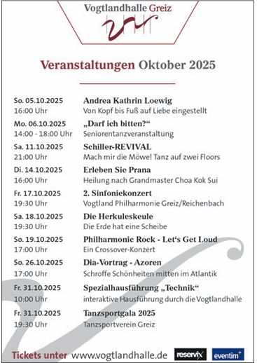 Ansonsten bietet der Herbstmonat im Greizer Kulturtempel Veranstaltungen für jedes Alter und (fast) jeden Geschmack. Das Spektrum reicht dabei vom Seniorentanz, zu dem DJ Leo am Montag einlädt, über das Schiller-Festival und einem Reisevortrag über die Azoren bis hin zu Philharmonic Rock und der großen Gala des Tanzsportvereins am 31. Oktober.
