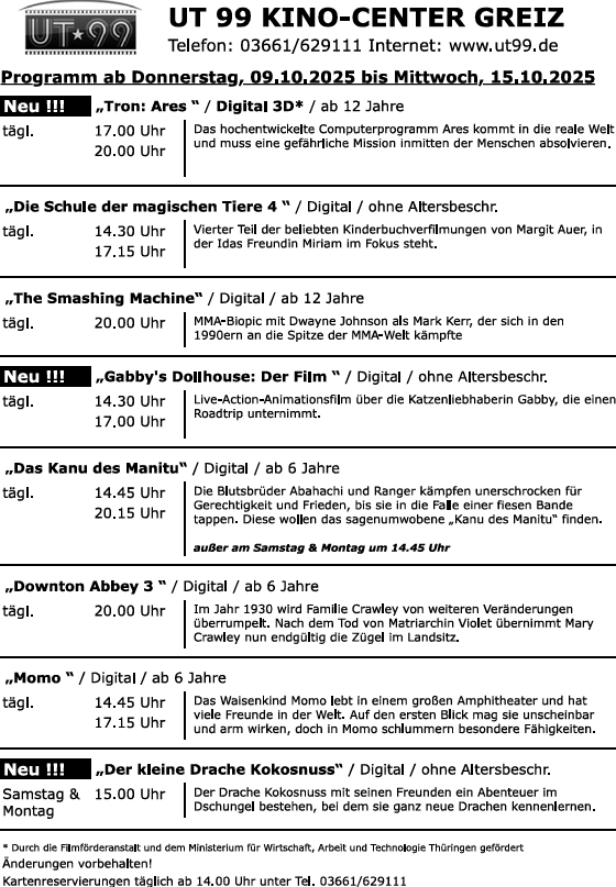 Hier alle Filme im Greizer UT 99 vom 9. bis 15. Oktober auf einen Blicke: