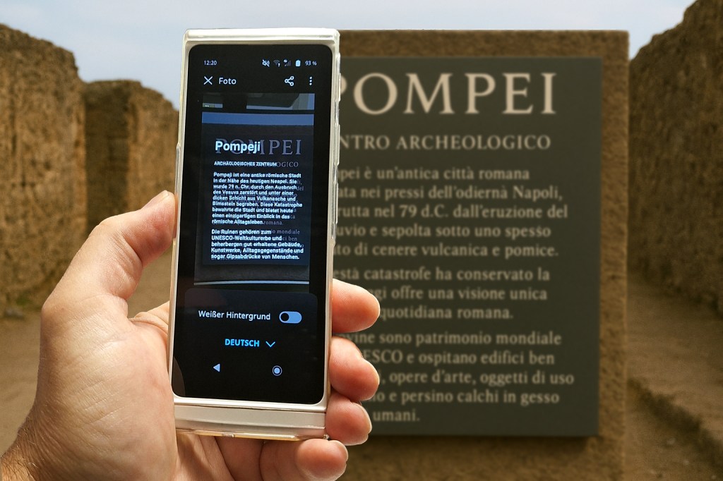 Besonders der Zwei-Wege-Sprachübersetzer ermöglichte eine (fast) echte Unterhaltungen und damit eine einfache Verständigung. Ganz wichtig ist bei der Verwendung, dass man nur kurze Sätze verwendet. Bei längeren Ausführungen verhaspelt sich manchmal die Übersetzung und es kommt etwas anderes heraus. Meine italienischen Gesprächspartner lobten die Aussprache des Gerätes.