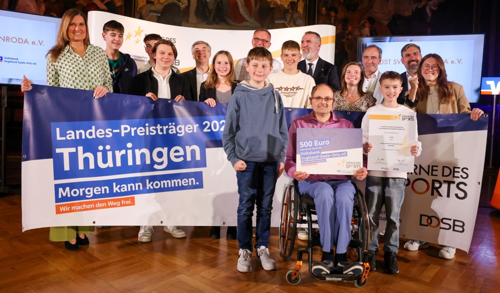 Viel Ehre und Lob gab es am gestrigen Dienstagabend (21. Oktober) im Erfurter Rathaus für sechs Sportvereine aus Thüringen, darunter auch der TC submarin Pößneck e.V. und der Post SV Zeulenroda e.V. Die beiden Vereine wurden durch die Volksbank Vogtland-Saale-Orla eG begleitet, da sie auf regionaler Ebene am 17. September 2025 im Freizeitpark Plohn jeweils den großen „Stern des Sports“ in Bronze bekommen hatten.