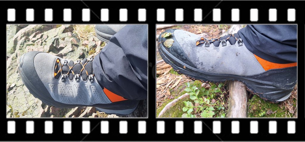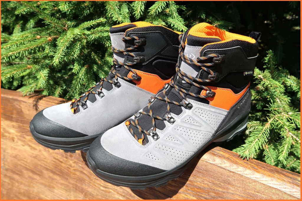 Die Freundschaft mit dem Wanderschuh begann im Thüringer Wald, einer Region mit abwechslungsreichen Untergründen: von Schotterwegen und Wiesen über wurzeldurchzogene Pfade und Bachläufe bis hin zu Kalkstein und Schiefer. Das Obermaterial aus Wildleder und Stretchgewebe in einem Mix aus Grau, Schwarz und einem kräftigen Orangeton, einer Vibram Adapta-Sohle mit dem AKU-eigenen Elica-System, welches sich der natürlichen Neigung von Ferse und Vorfuß anpasst. Dazu ein Profil aus Flex-Rillen, Flex-Stollen und Root lugs im Mittelbereich der Sohle. Dank des cleveren Ösensystems lässt sich der Schuh optimal schnüren.