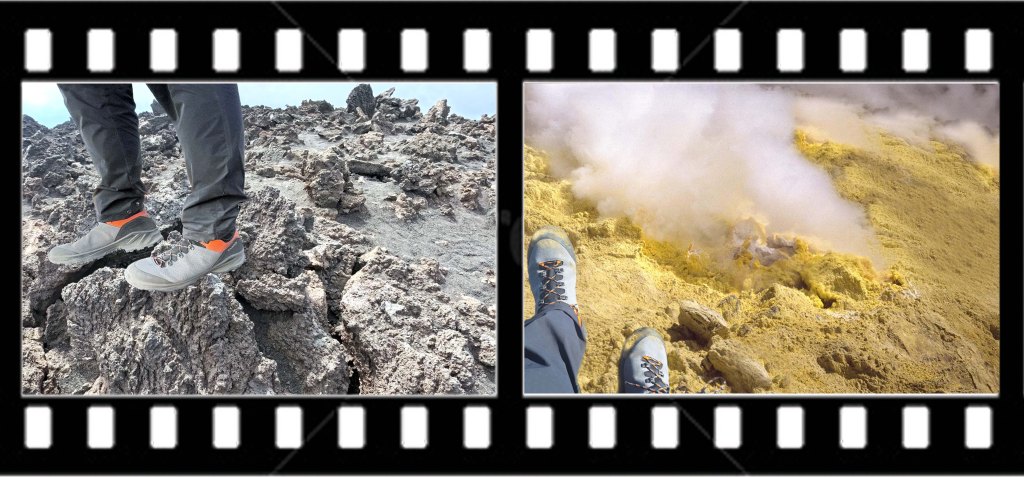 Eine weitere Herausforderung stellte der Vulkan Vulcano auf den Liparischen Inseln vor Sizilien dar. Im Kraterbereich entweichen schwefelhaltige, stechend riechende Dämpfe, während man sich auf staubigem, unebenem Gelände bewegt. Schmale Pfade führen an den Fumarolenfeldern vorbei – stets mit der Vorsicht, nicht in die heißen, säurehaltigen Vertiefungen zu treten. Auf Anraten des Bergführers spülte ich den gelblich-matschigen Schwefelrand nach der Tour gründlich ab. Die AKU-Schuhe hielten einwandfrei durch – ohne sichtbare Schäden an Material oder Sohlen.