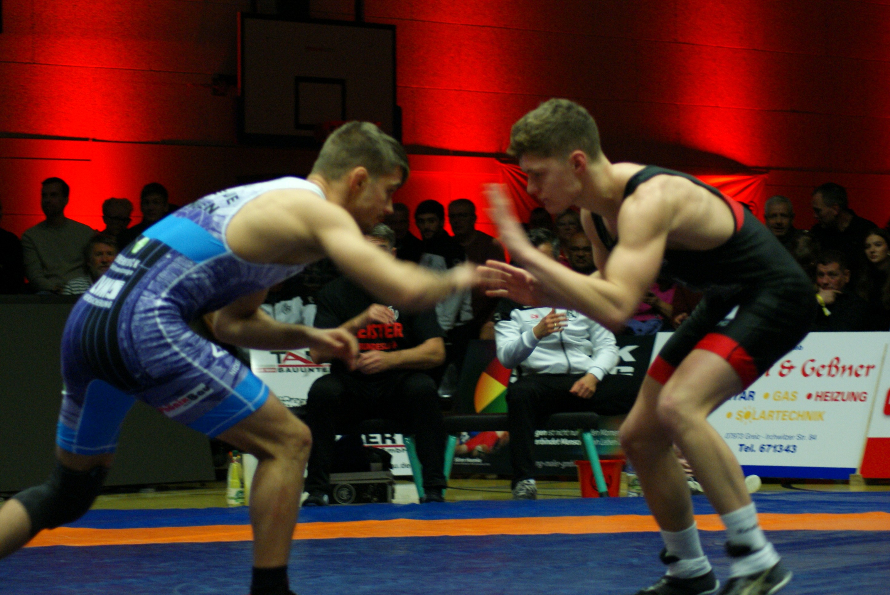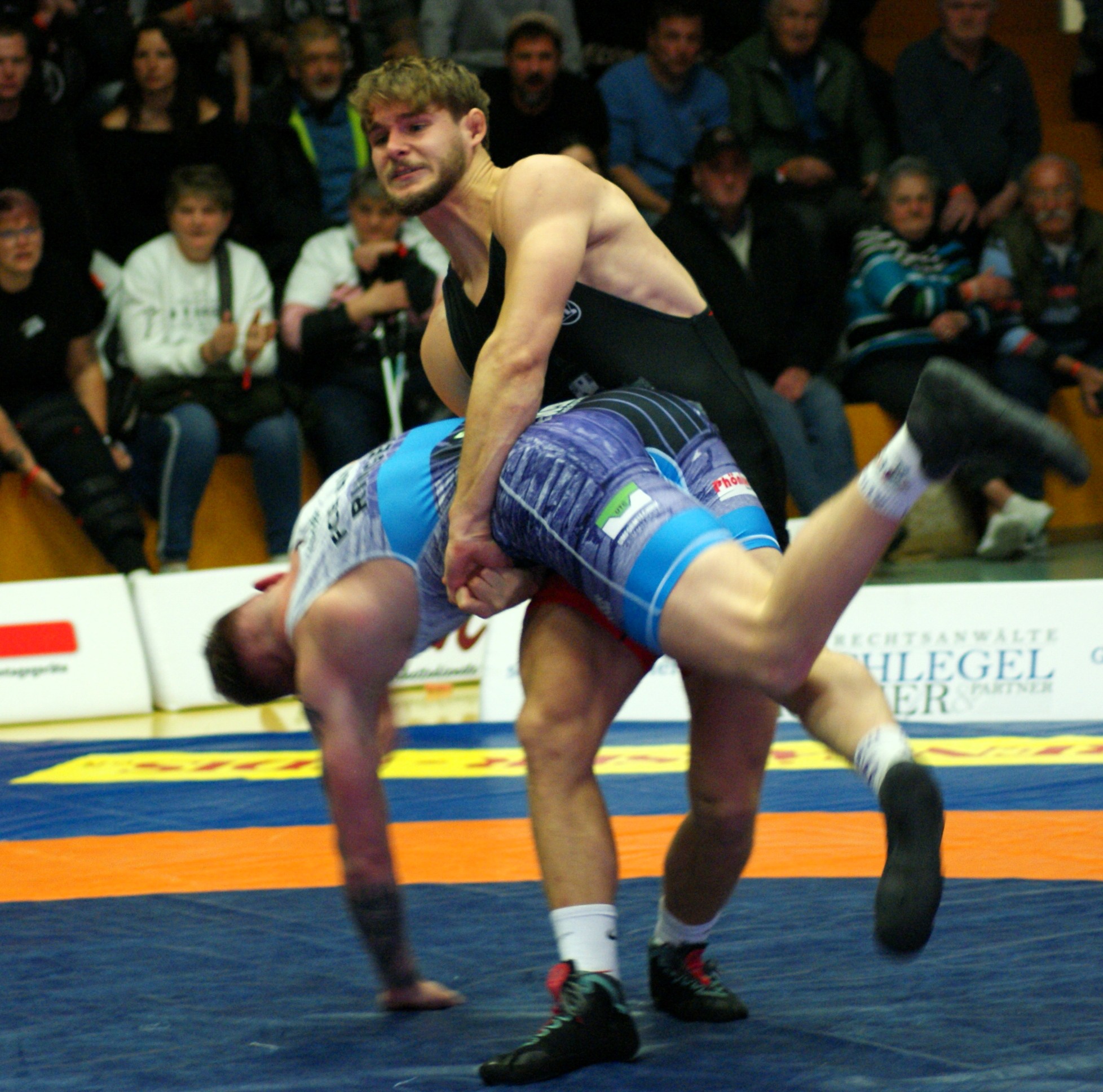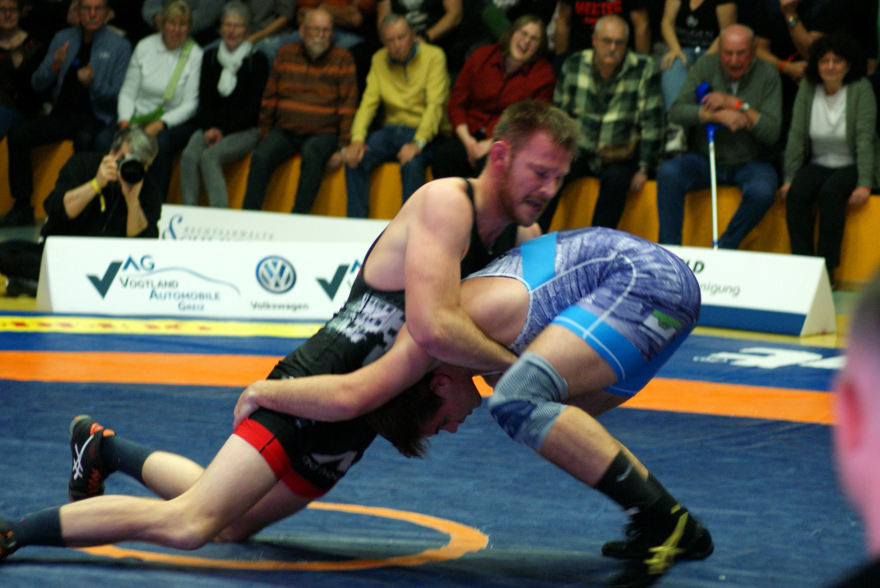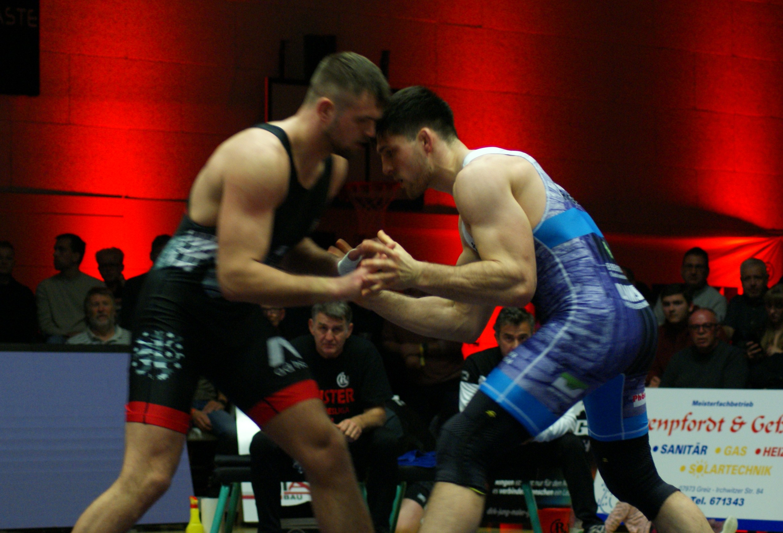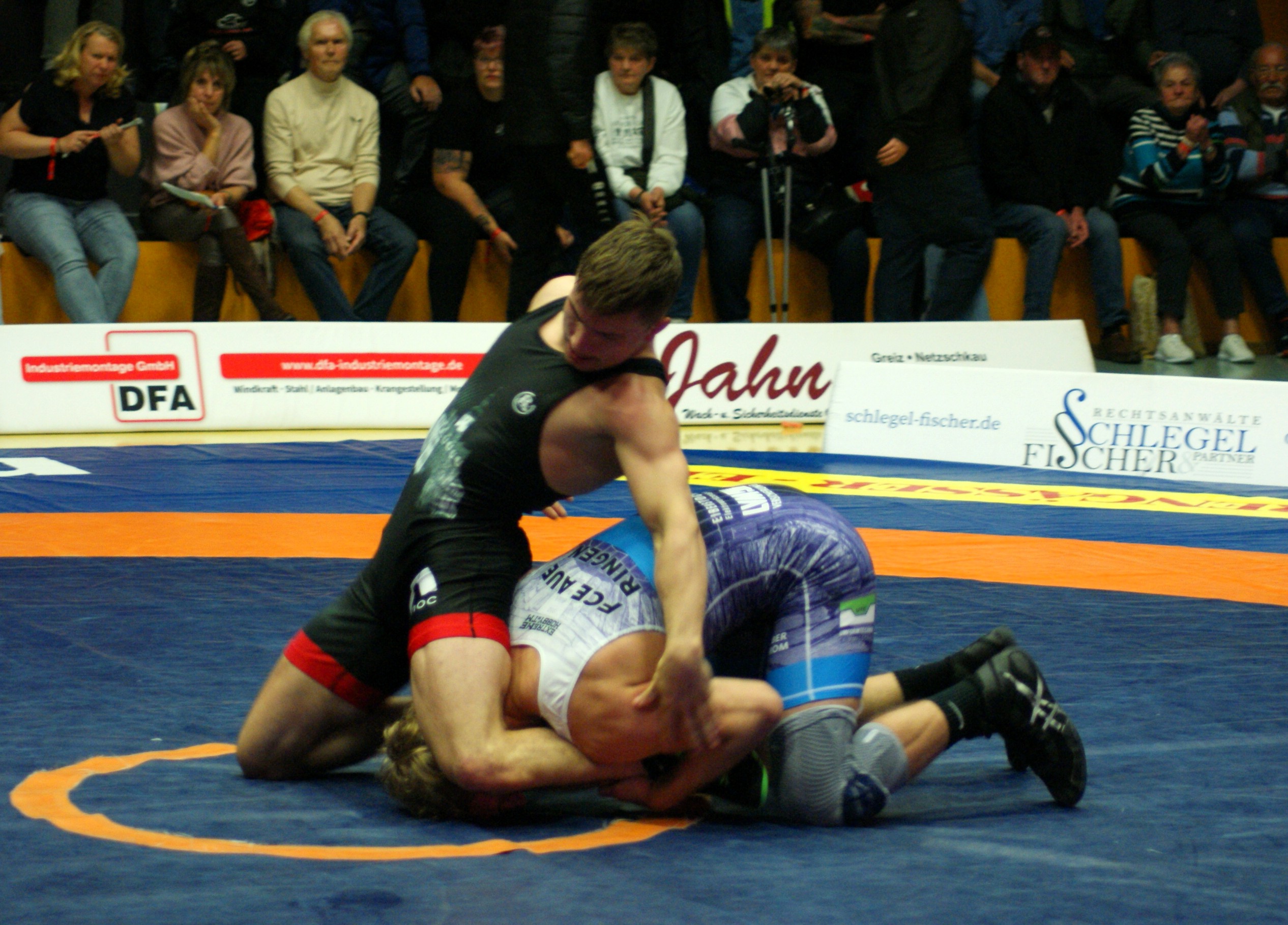 Nach dem Ausfall von Karamjeet Holstein stieß Robin Nuding erstmals in diesem Jahr ins Team. Kein Problem mit dem Gewicht. Allerdings, er ist gelernter Griechisch-römisch-Spezialist und traf auf den starken Freistilringer Teetje Richter. In der ersten Minute schon 0:4 im Rückstand. Da dürften wohl vier Punkte weggehen, dachten Viele. Bis zur Halbzeit hielt sich der Schwabe aber gut, nur 0:6. Am Boden hatte sich der Greizer sogar hervorragend verteidigt. Würde er weiterhin die für die Grecos tödlichen Beinschrauben abwehren können? 0:12 und noch 90 Sekunden zu Ringen. Sekunden können zur Ewigkeit werden. Doch dann der Schlusspfiff. Robin Nuding hatte nur 0:13 verloren. Eine Superleistung! Standing Ovations für eine Niederlage!