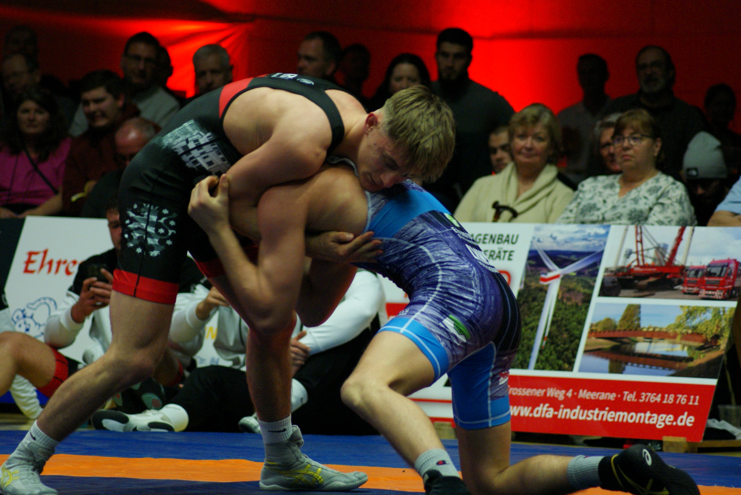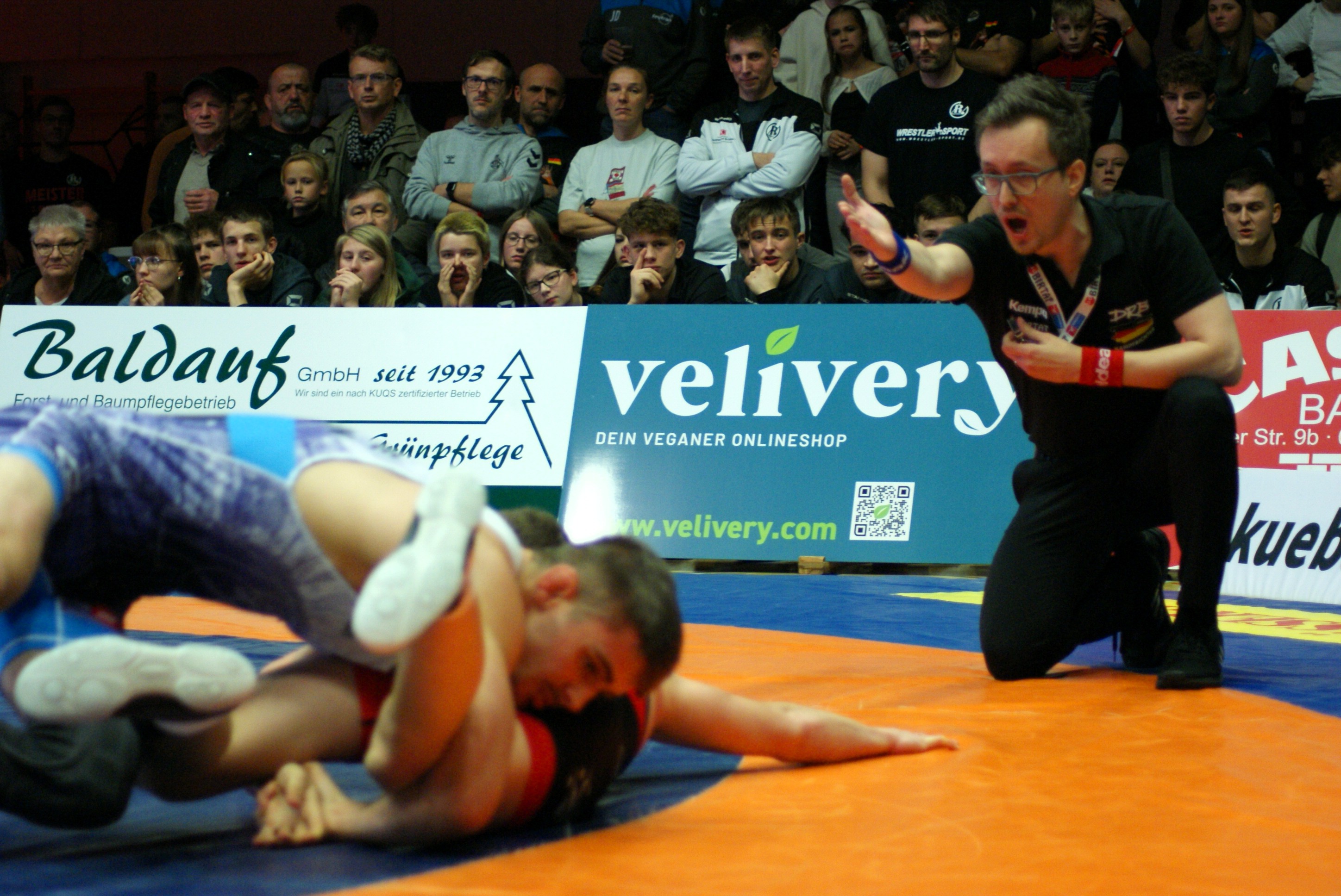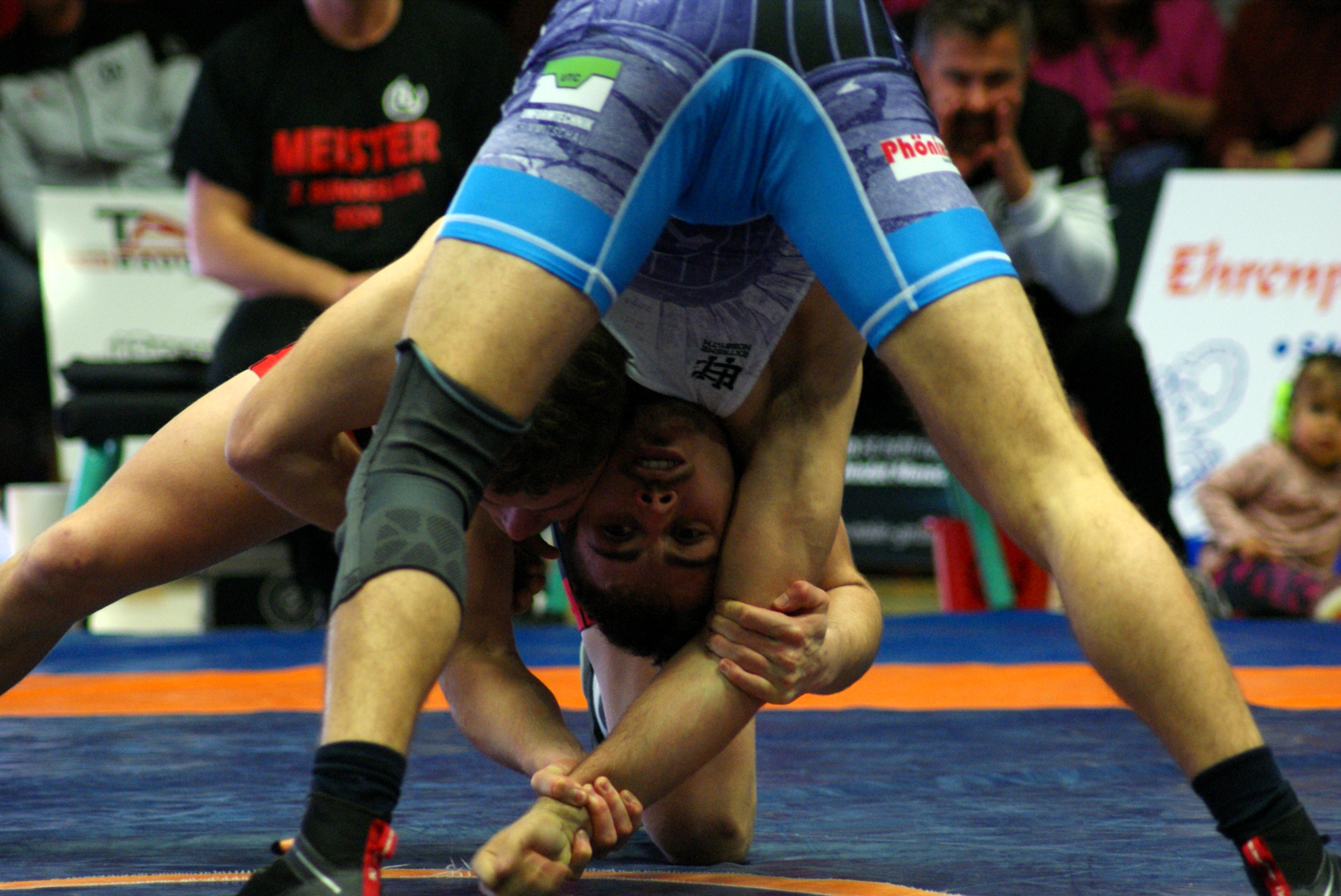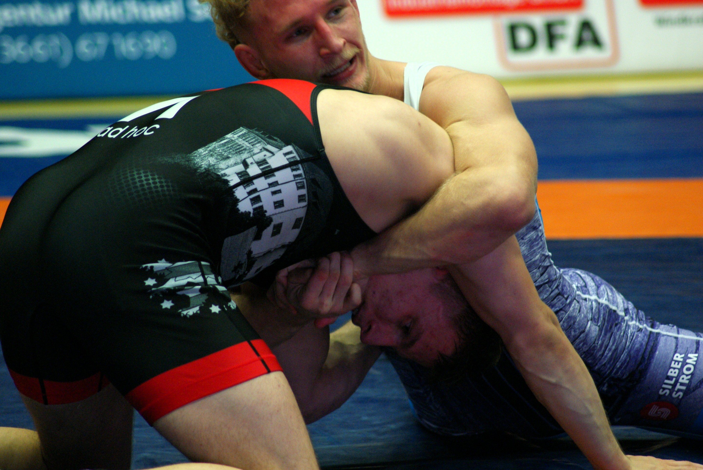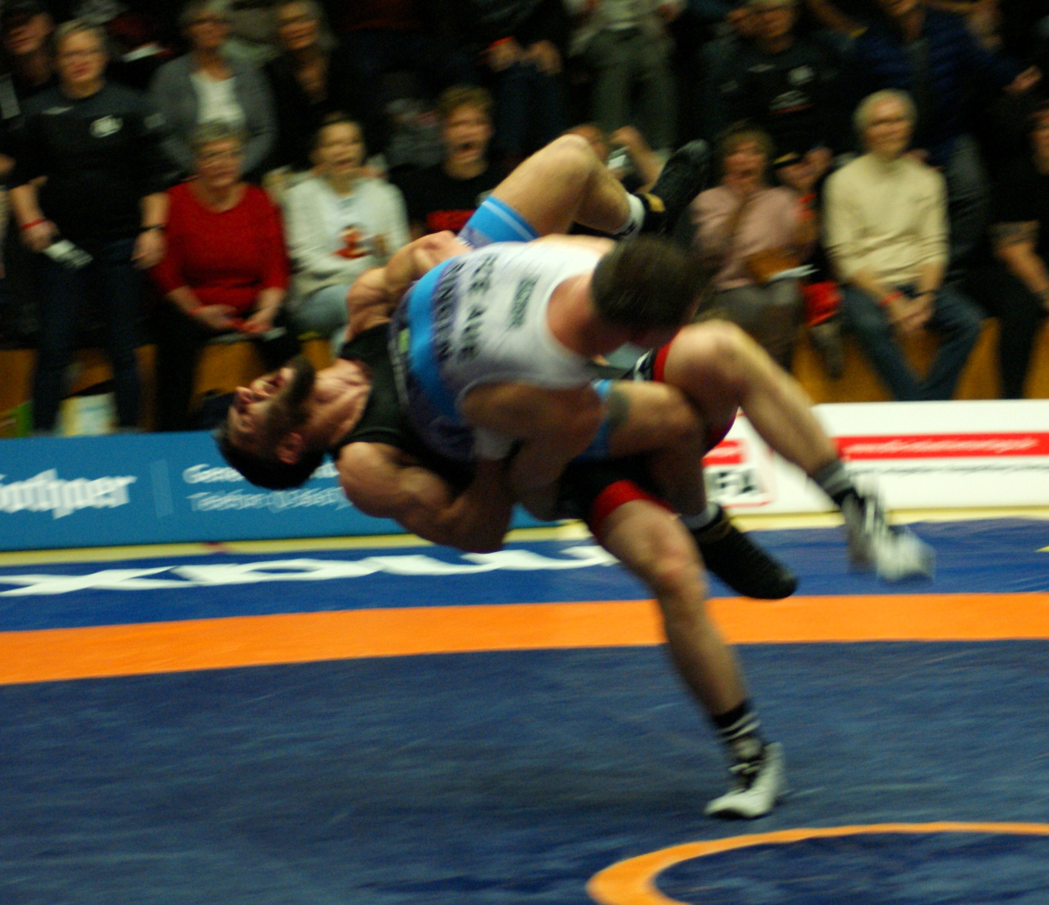 Nach dem Ausfall von Karamjeet Holstein stieß Robin Nuding erstmals in diesem Jahr ins Team. Kein Problem mit dem Gewicht. Allerdings, er ist gelernter Griechisch-römisch-Spezialist und traf auf den starken Freistilringer Teetje Richter. In der ersten Minute schon 0:4 im Rückstand. Da dürften wohl vier Punkte weggehen, dachten Viele. Bis zur Halbzeit hielt sich der Schwabe aber gut, nur 0:6. Am Boden hatte sich der Greizer sogar hervorragend verteidigt. Würde er weiterhin die für die Grecos tödlichen Beinschrauben abwehren können? 0:12 und noch 90 Sekunden zu Ringen. Sekunden können zur Ewigkeit werden. Doch dann der Schlusspfiff. Robin Nuding hatte nur 0:13 verloren. Eine Superleistung! Standing Ovations für eine Niederlage!