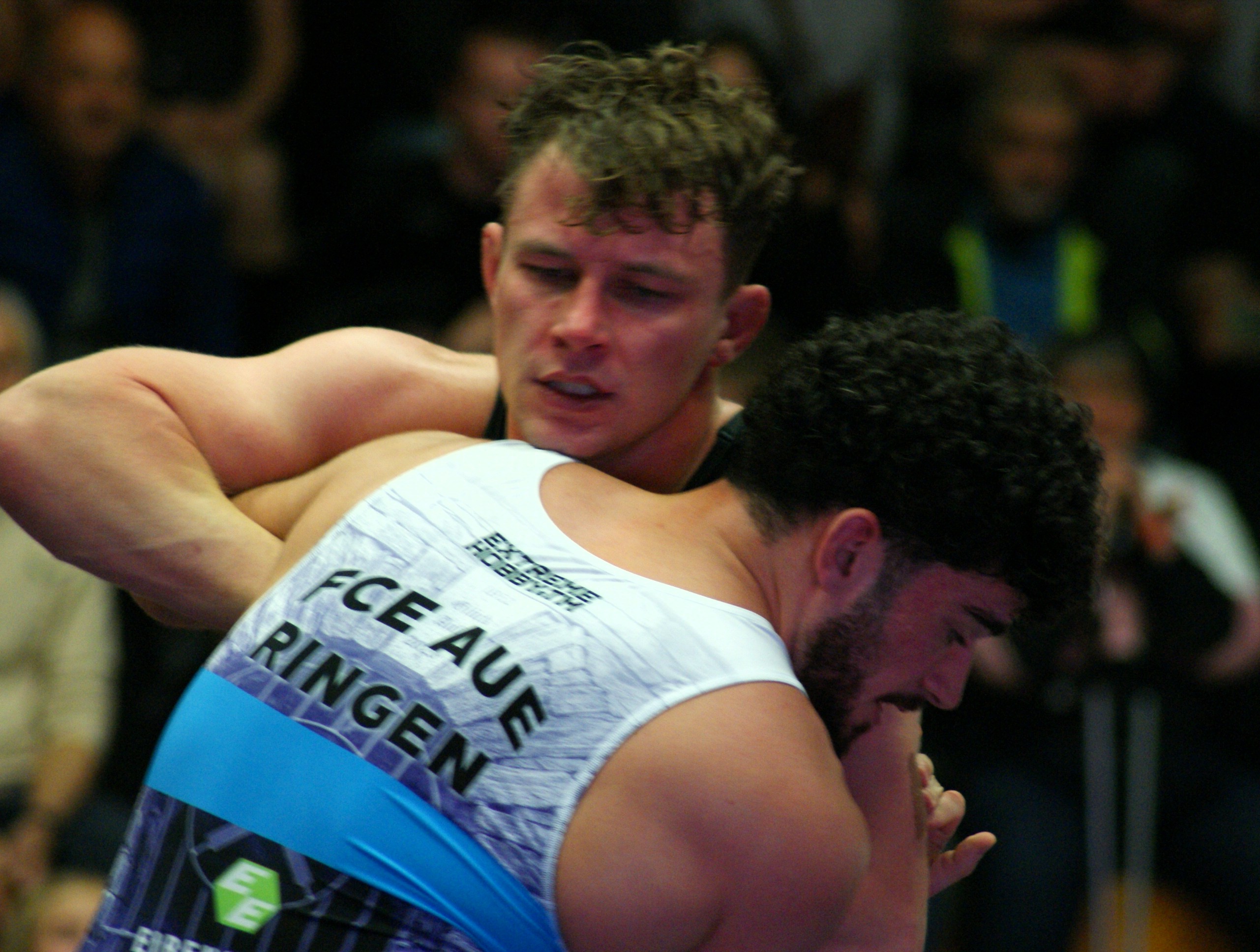 Doch dann gab es neue Ausfälle. Karamjeet Holstein verletzte sich vorige Woche bei der U23-WM. Auch Alex Szöke, ein fester Punktgarant, konnte nicht eingesetzt werden. Nun war guter Rat für Trainer Tino Hempel teuer. Wie konnte er die verbliebenen Sportler so einsetzen, dass sie in ihrer Gesamtheit die größte Wirkung erzielen konnten? Nach dem Ausfall des Japaners bei Aue, den Trainer Björn Schöniger wahrscheinlich versucht hätte gegen Nicolai Grahmez in der 75 kg-Klasse zu setzen, war die Sache noch komplizierter geworden. Der Greizer Trainer hatte eine Idee, die am Ende aufging. Er nahm im freien Stil Moritz Langer aus der 71 kg-Klasse in die 75 kg-Klasse und ließ dafür Nicolai Grahmez ebenfalls eine Klasse aufrücken. Und der Wechsel zahlte sich aus. In den letzten vier Kämpfen sicherten sich die Greizer 13 Punkte und gewannen vor der gewaltigen Zuschauerzahl von 980 Besuchern das Derby gegen die Erzgebirger. Eine taktische Meisterleistung.