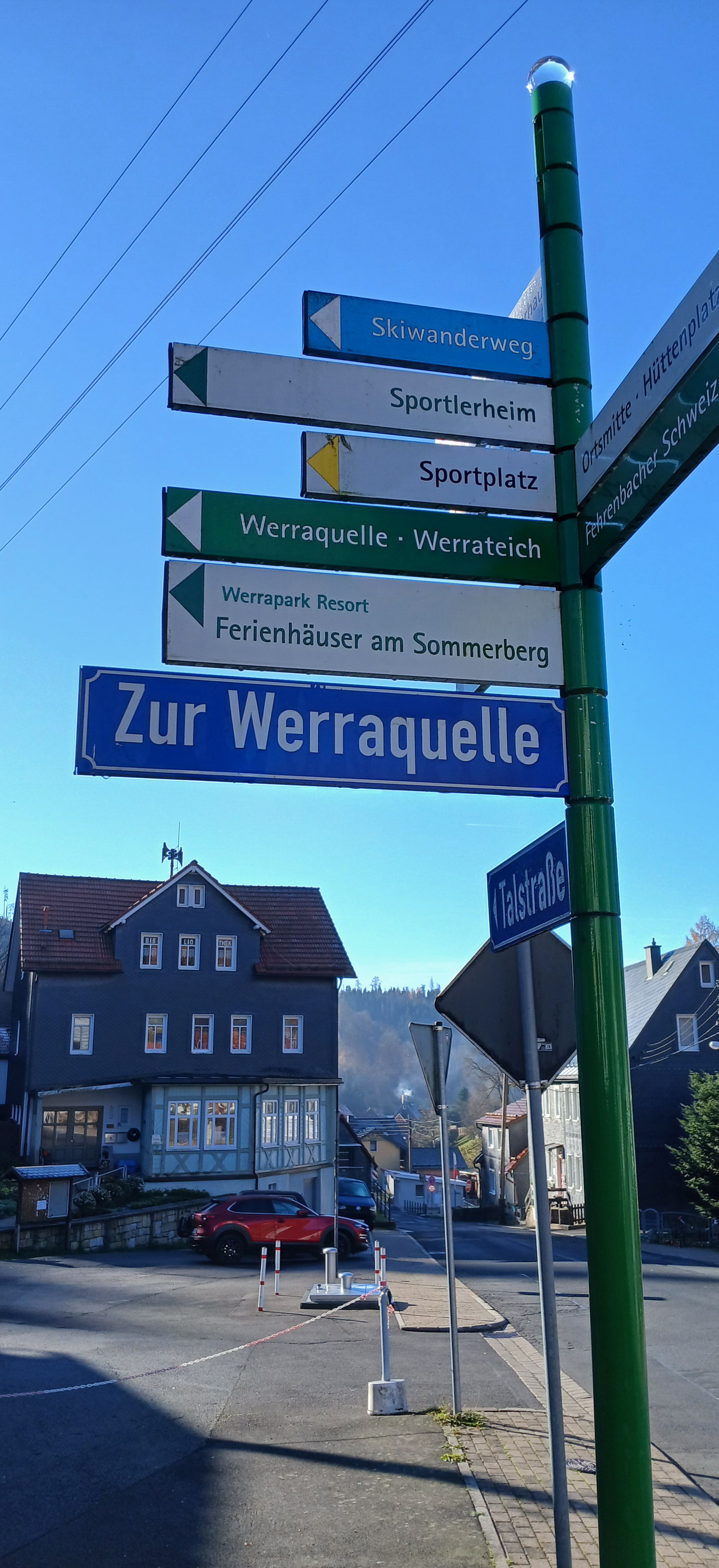 Ausgangspunkt war Fehrenbach, wo uns in der Ortsmitte ein nicht zu übersehendes Schild den Weg zur Werraquelle wies. Von 580 Metern über NN begann der Aufstieg. Vorbei am groß angelegten Werrapark Ressort Hotel Sommerberg und dem Sportplatz ging es zunächst bis zum Masserberger Höhenweg. Der Aufstieg bis dahin war recht steil und schon eine kleine Herausforderung. Doch hat man diese bewältigt, führt der Masserberger Höhenweg sehr entspannt Richtung Werraquelle.