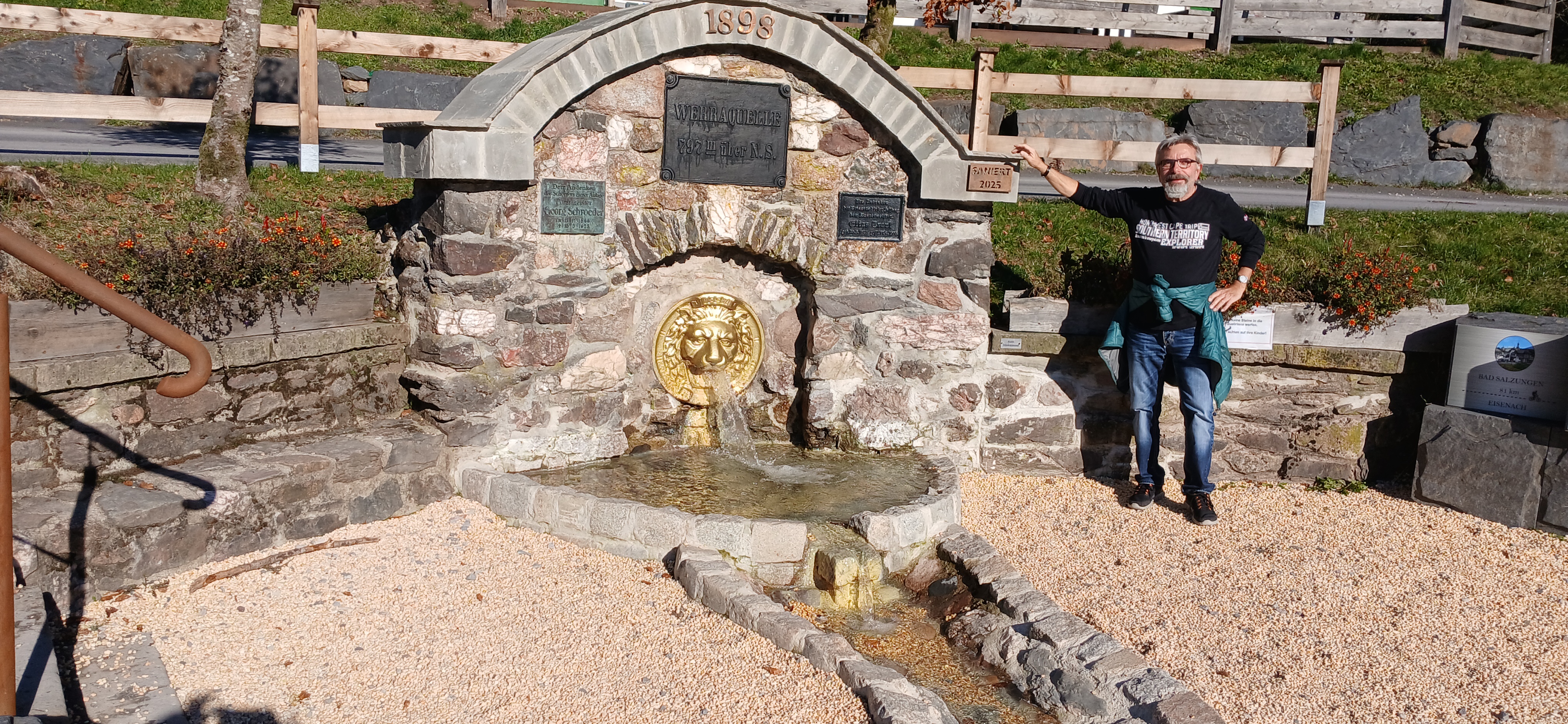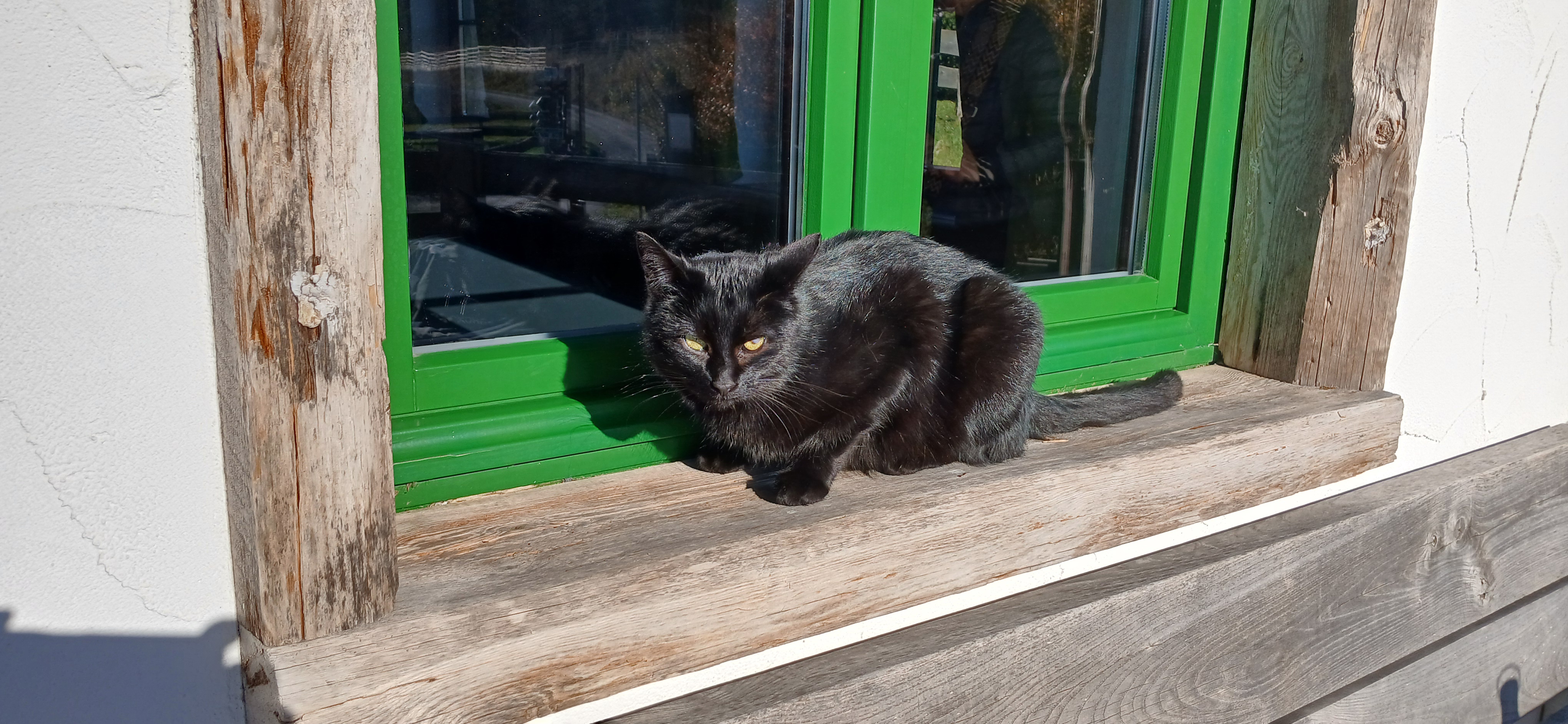 Diese ist in einer schönen Anlage integriert, die von der Werraquell-Hütte überragt wird. Leider hatte die Gaststätte bei unserer Ankunft wegen Betriebsferien vom 3. November bis 5. Dezember geschlossen. Doch das störte uns nicht so sehr – auf der Sonnenterrasse konnten wir bei bei frühlingshaften Temperaturen entspannen. Begleitet von einer schwarzen Katze, die offenbar das Anwesen bewacht.