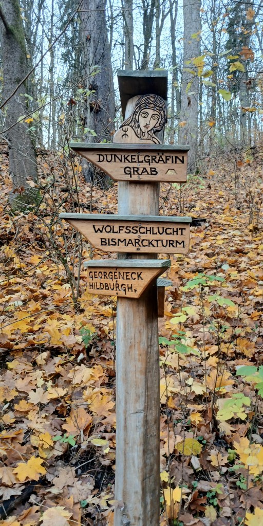 Nach einem Stadtrundgang und einem Spaziergang durch den Schlosspark besuchten wir natürlich auch das Grab der Dunkelgräfin. Die Grabstätte unter dichtem Laubbefall machte einen eher schlichten Eindruck. Der Spaziergang dahin ist dennoch lohnenswert, Trittfestigkeit vorausgesetzt, zumal der Stadtberg unter anderem mit dem Bismarckturm noch einiges mehr bietet.