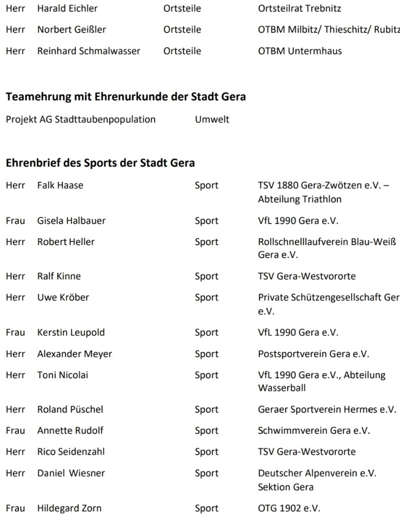 Die Stadt Gera bedankt sich bei allen Ehrenamtlichen für ihren täglichen Einsatz, die stellvertretend für viele weitere Menschen stehen und ehrt dafür in diesem Jahr 39 Personen.
