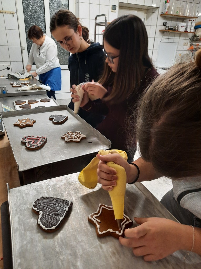 Aber danach ging es eifrig zur Sache. Unter kompetenter Anleitung der Bäckermeister wurde der Brotteig abgewogen, geknetet, mit Wasser bestrichen und mit Mohn, Kürbis- und Sonnenblumenkernen und Sesam verziert. Nach Pfarrer Gunnar Peukert sollten dabei Adventssymbole auf den Broten entstehen. Nach dem Brot waren die Plätzchen an der Reihe. Mit Tannenbaum-, Sternen-, Glocken- und Engelsformen wurden der helle und dunkle Teig ausgestochen und dann mit Marmelade und Mandelsplittern dekoriert. Der dritte Arbeitsgang war die Verzierung der vorbereiteten Lebkuchensterne mit Schokolade und Zuckerglasur. Dazu gab Achim Bechers Frau Mandy Tipps und Hinweise. Die Mädchen erwiesen sich dabei als äußerst kreativ. Am Ende waren sich alle Konfis einig: Es hat richtig viel Spaß und Freude gemacht.
