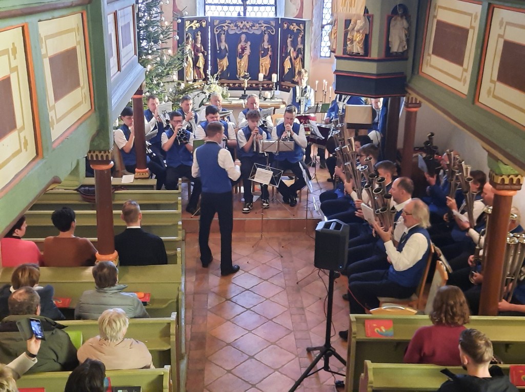 Was für ein Weihnachtsgottesdienst am zweiten Weihnachtsfeiertag in der Bernsgrüner Kirche. Mit einem stimmgewaltigen Medley aus bekannten traditionellen Weihnachtsliedern begrüßte die Schalmeienkapelle Bernsgrün unter Leitung von Matthias Dübler die Gottesdienstbesucher. Was folgte war ein Wechselspiel zwischen Pfarrer Gunnar Peukert und den Musikern. Der Pfarrer begleitet mit Worten, die Schalmeien mit Musik. „Es ist Weihnachten. Zeit, auf die alten Texte zu hören und die alten Lieder zu singen. Die Hoffnung bekommt ein Gesicht. Gott ist Mensch geworden. Wir haben mit der Geburt Jesu ein besonderes Weihnachtsgeschenk erhalten. Er ist zu uns gekommen und er bleibt“, so der Pfarrer. Das Verlesen der Weihnachtsgeschichte wurde immer wieder mit Schalmeienliedern, wie „Der kleine Trommler“ und „Ihr Kinderlein kommet“, begleitet. Und auch von Träumen des Engels, Maria und Josefs und den eigenen Träumen erzählte Pfarrer Peukert. Träume von Menschen, die Brücken bauen, statt Mauern aufzubauen, vom Frieden, dass Kinder wissen, was es bedeutet, im Frieden aufzuwachsen und ein Traum von allen Menschen, dass Weihnachten wird, ein friedvolles Fest voller Hoffnung und Menschlichkeit. Viel dankenden Applaus gab es am Ende für die Schalmeienmusiker, die wieder ihr Bestes auf ihren Instrumenten gaben und den Gottesdienst eine besondere feierliche Note gaben.