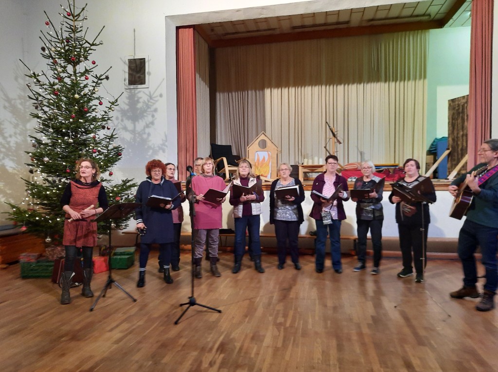„Wir sind gekommen, um etwas zu bleiben“, verkündete danach der Singkreis Schönbach unter Leitung von Kathrin Hempel. Er verbreitete mit traditionellen, erzgebirgischen und neueren besinnlichen Weihnachtsliedern, den Geschichten vom Weihnachtsbacken, dem Wunschzettel und der Weihnachtsmannfrau weihnachtliche Stimmung im Saal, wofür es viel Beifall gab.