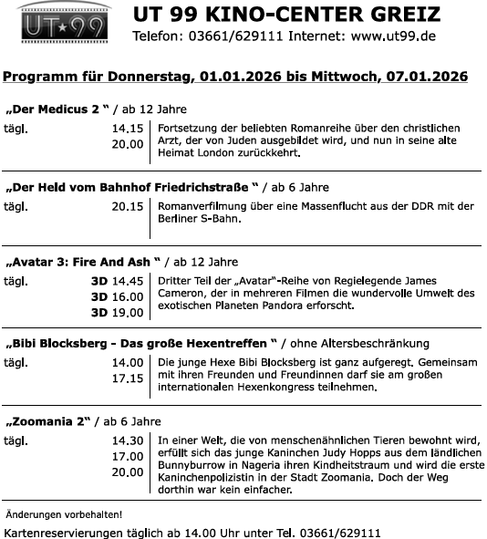 Dazu gibt es ab dem Neujahrstag vier weitere Filme für jedes Alter und (fast) jedes Interesse im Programm – von „Bibi Blocksberg“ bis zum zweiten Teil des „Medicus“.