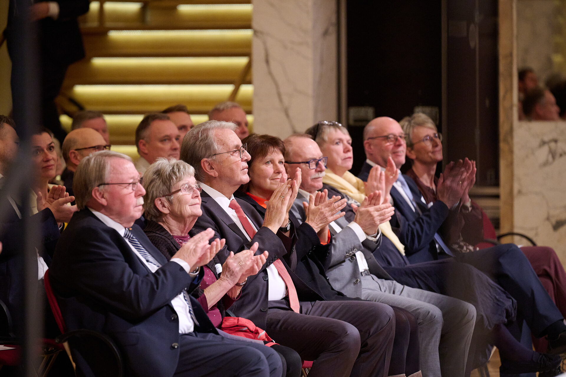 Die Möglichkeit, im Foyer bei einem kleinen Imbiss miteinander ins Gespräch zu kommen und Kontakte zu pflegen, nutzten dann etliche der Gäste. Zu diesen zählten die Ehrenbürger Jürgen Croy, Bernd-Lutz Lange und Rainer Eichhorn. Dessen beiden Nachfolger im Amt des Oberbürgermeisters, Dietmar Vettermann und Dr. Pia Findeiß, waren ebenfalls anwesend. Zu den Gästen zählten weiterhin unter anderem Bundes- und Landtagsabgeordnete, Landrat Carsten Michaelis sowie Oberbürgermeister und Bürgermeister des Landkreises. Vertreter von Vereinen und Verbänden, von kommunalen Gesellschaften und Zweckverbänden, von Freiwilligen Feuerwehren und Hilfsorganisationen sowie zahlreiche Unternehmer und weitere Persönlichkeiten machten die Vielfalt der geladenen Gäste aus. Aus der tschechischen Partnerstadt Jablonec nad Nisou war Bürgermeisterin Jana Hamplová angereist, und aus Volodymyr Mitarbeiterinnen der Stadtverwaltung, die sich derzeit zu einem Arbeitsbesuch in der Automobil- und Robert-Schumann-Stadt aufhalten.