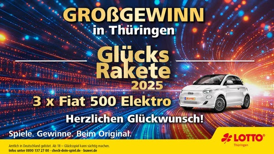 Der Hauptpreis von 250.000 Euro ging diesmal nach Mecklenburg-Vorpommern. Die GlücksRakete erfreut sich seit Jahren großer Beliebtheit und überzeugt mit attraktiven Sach- und Geldgewinnen. Neben spannenden Gewinnchancen unterstützt LOTTO Thüringen mit seinen Produkten zudem zahlreiche gemeinnützige Projekte im Freistaat.