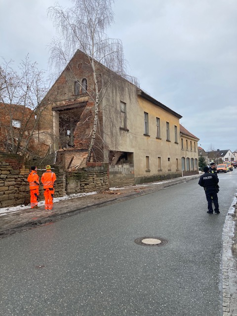 Greiz (ots), Pölzig. Gestern gegen 11 Uhr stellte die Polizei fest, dass in der Hauptstraße von Pölzig der Dachstuhl eines Hauses eingestürzt war und die Fassade drohte, auf die Straße zu fallen. Die L1081 musste daraufhin zunächst voll gesperrt werden.