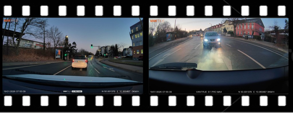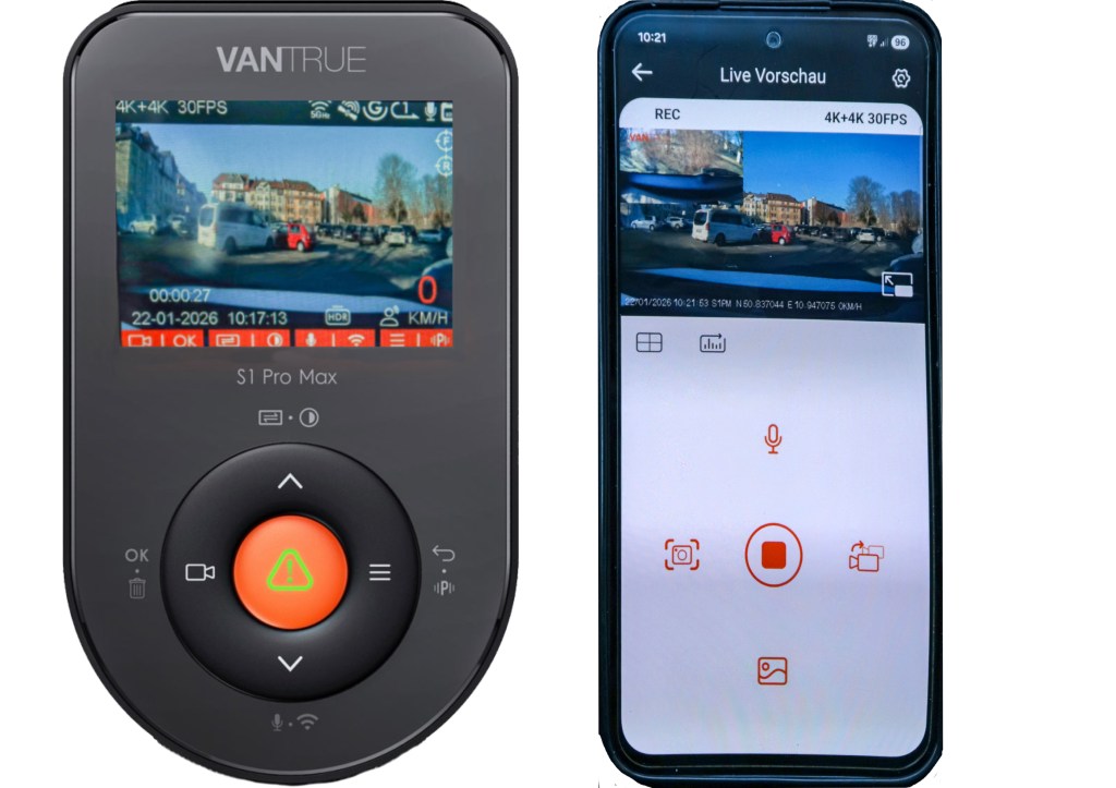 Als eines der derzeit innovativsten Modelle positioniert sich die VANTRUE S1 Pro Max. Das System setzt auf zwei leistungsstarke STARVIS-2-Sensoren (Sony IMX678) und zeichnet sowohl vorne als auch hinten in echter 4K-Auflösung auf. Das Ergebnis: gestochen scharfe, detailreiche Aufnahmen in nahezu allen Fahrsituationen.