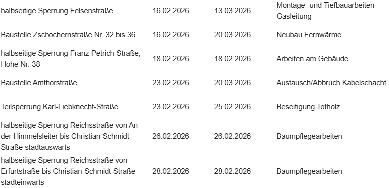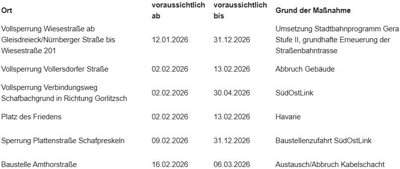 Weitere Informationen zum Verkehr und zu aktuellen Baustellen auch im Geoportal der Stadt Gera unter www.gera.de/verkehrsmeldungen.