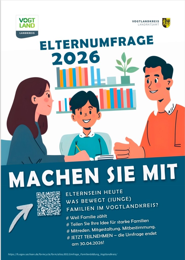 Die Online-Umfrage ist anonym, dauert nur wenige Minuten und kann noch bis zum 30. April 2026 ausgefüllt werden. Die gewonnenen Erkenntnisse fließen direkt in die Weiterentwicklung familienunterstützender Angebote im Vogtlandkreis ein.
