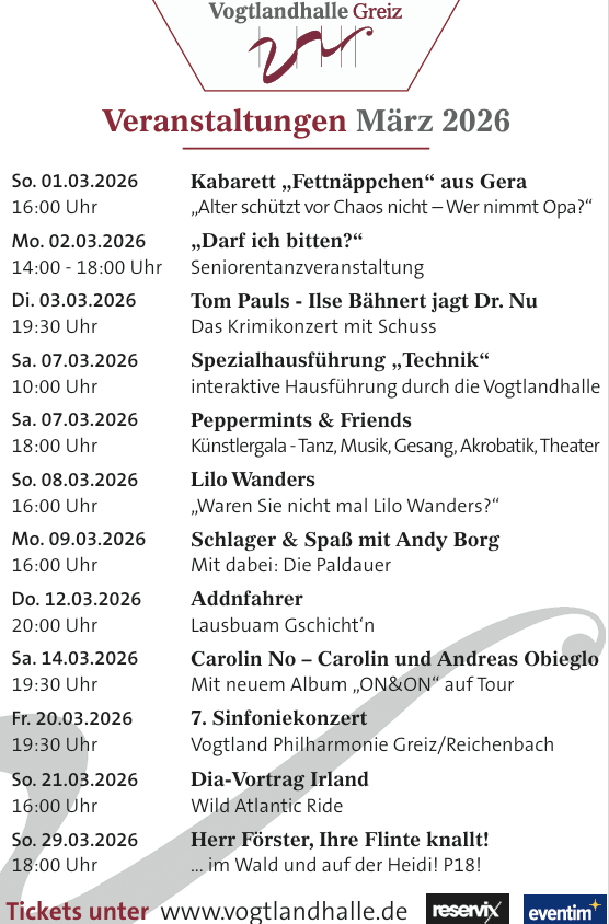 Den kommenden Monat startet im Greizer Kulturtempel am Sonntag gleich mit einem Kabarettnachmittag. Dann gibt’s am Montag den traditionellen Seniorentanz mit DJ Leo und dann gibt’s ein breitgefächertes Veranstaltungsangebot – von Schlager und Klassik über einem spannenden Reisevortrag und einer Künstlergala bis hin zu einer Spezialhausführung nicht nur für Technikinteressierte. Und am Ende des Monats knallt die Flinte im Wals und auf der Heidi! Es dürfte also wieder für jedes Alter und so ziemlich für jeden Geschmack etwas dabei sein.