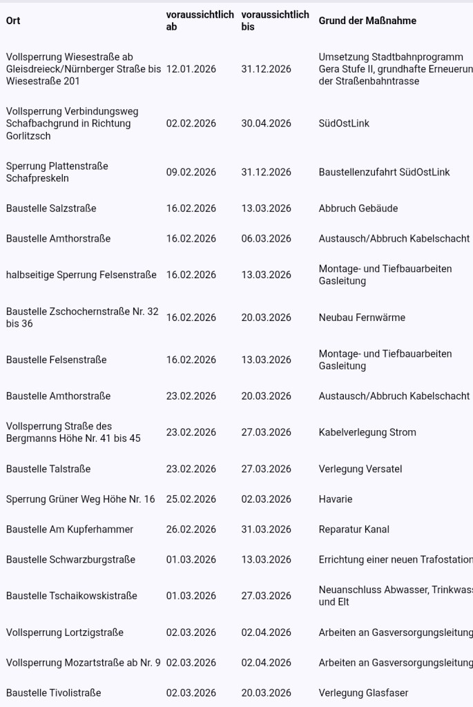 Weitere Informationen zum Verkehr und zu aktuellen Baustellen finden Interessenten auch im Geoportal der Stadt Gera unter www.gera.de/verkehrsmeldungen.