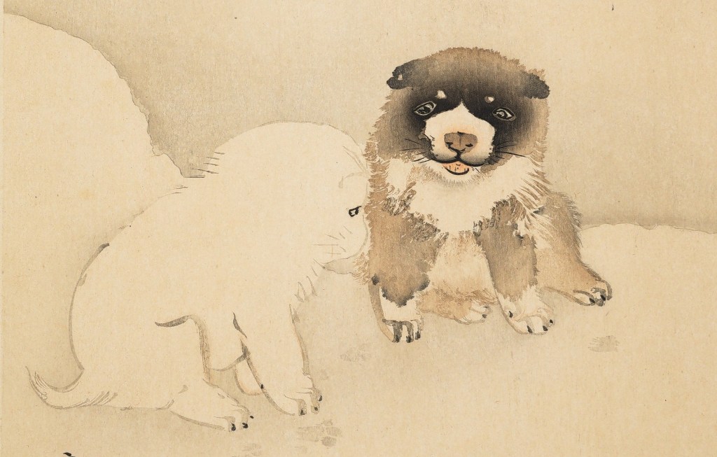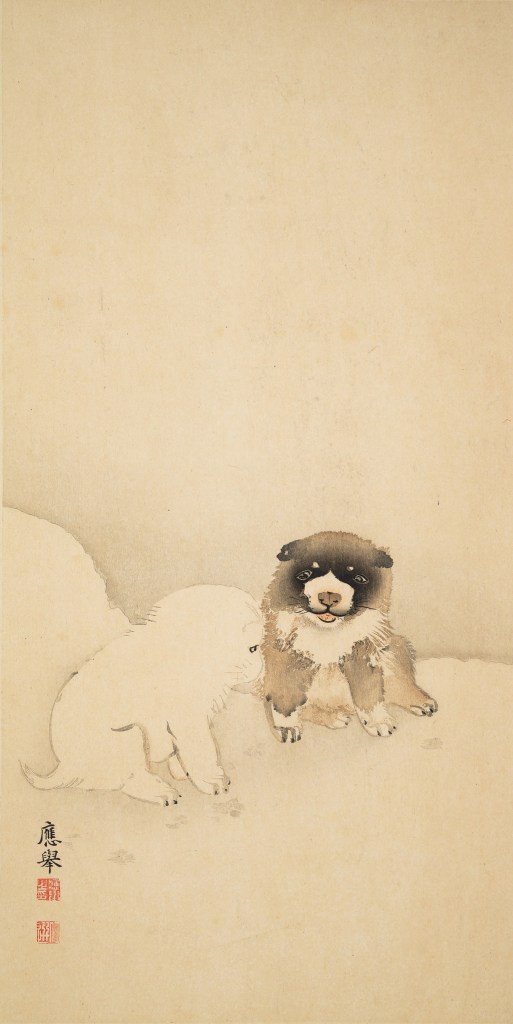 Die niedlichen Welpen tauchen in fast identischer Form immer wieder in den Werken des japanischen Malers Maruyama Ōkyo auf. In diesen Bildern greift er stets auf das „Kindchenschema“ zurück, welches den Betrachter unwillkürlich berührt. Damit wirkt die Komposition unheimlich zeitgemäß – umso mehr staunt man, dass dieses Werk über 250 Jahre alt ist. Das Blatt entstand im späten 18. Jahrhundert während der sogenannten Edo-Periode, die geprägt war durch Frieden und Stabilität unter dem Tokugawa-Shogunat. Diese über 250 Jahre währende Friedensperiode war eine Blütezeit der bildenden Künste in Japan.