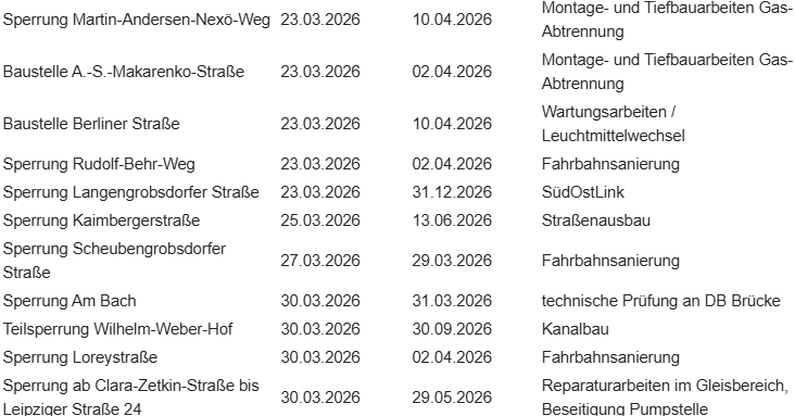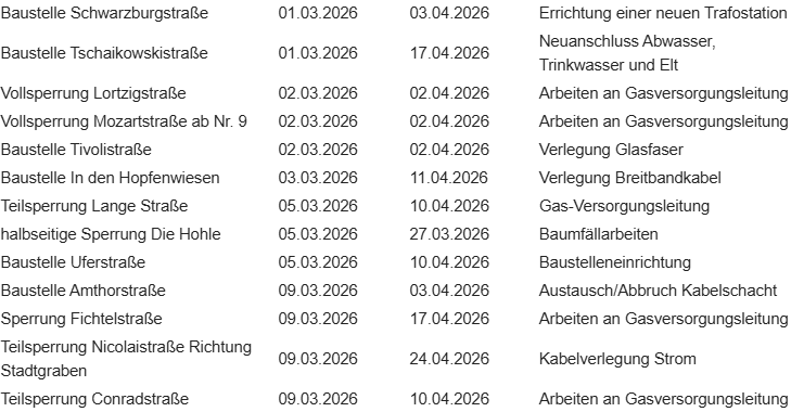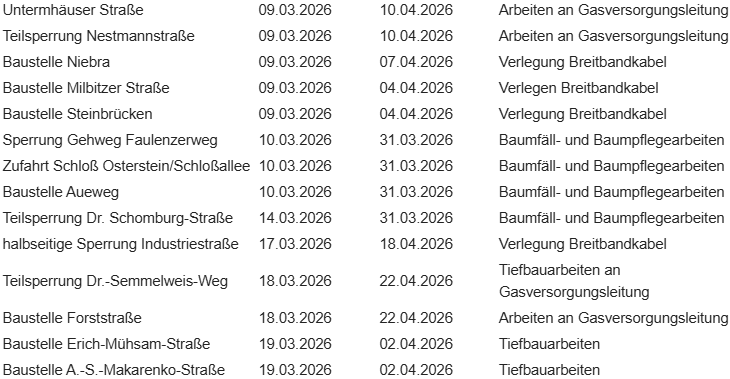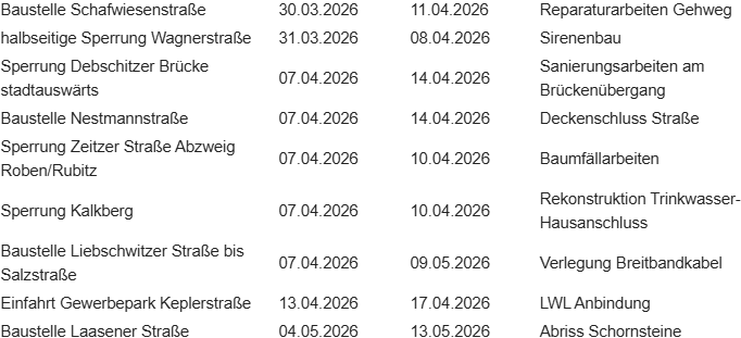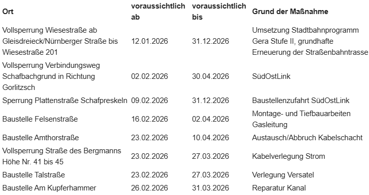 Weitere Informationen zum Verkehr und zu aktuellen Baustellen finden Interessierte auch im Geoportal der Stadt Gera unter www.gera.de/verkehrsmeldungen.