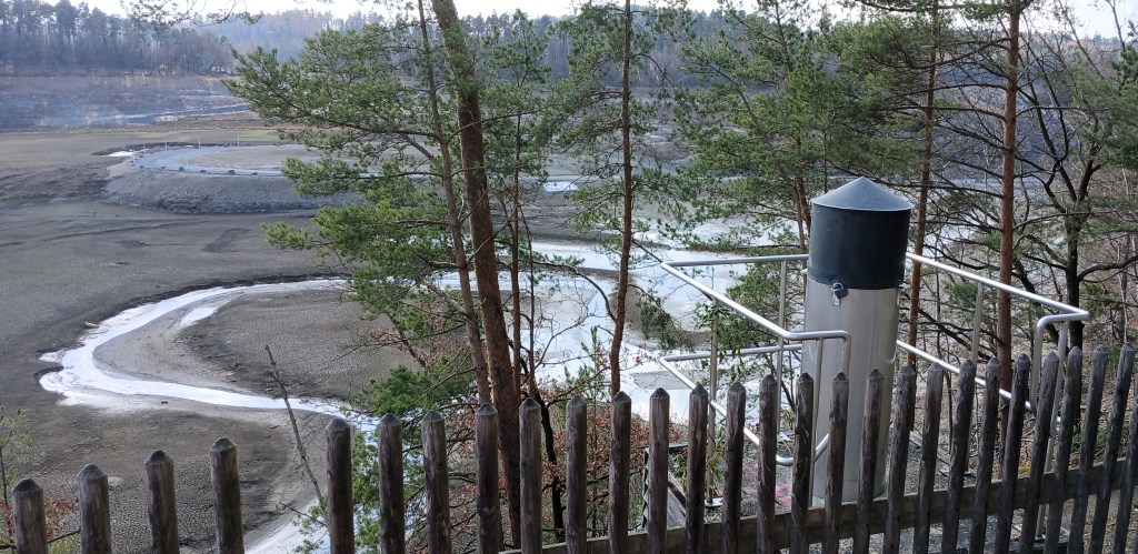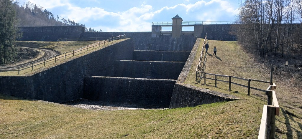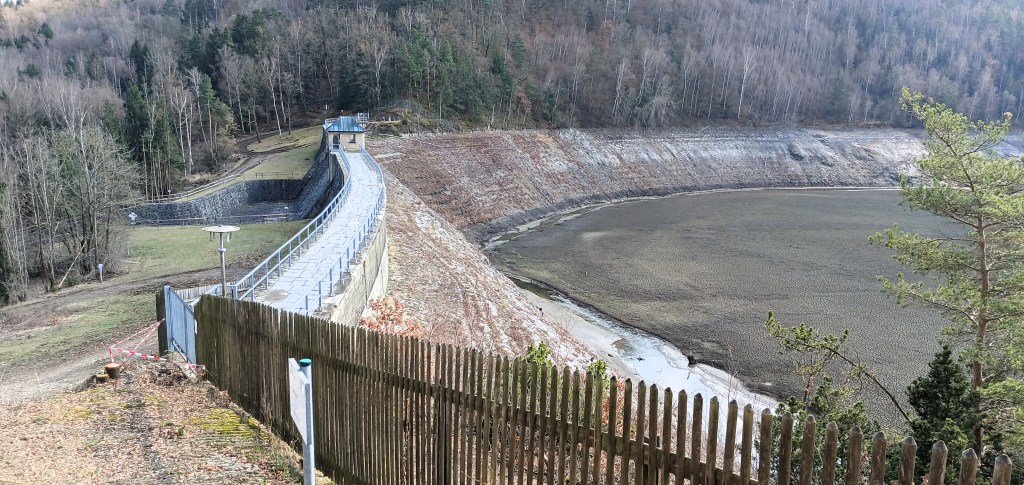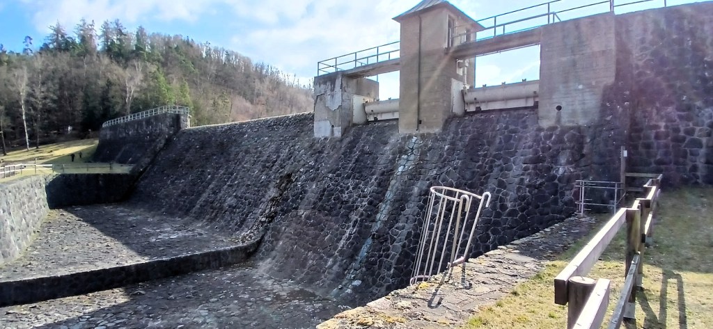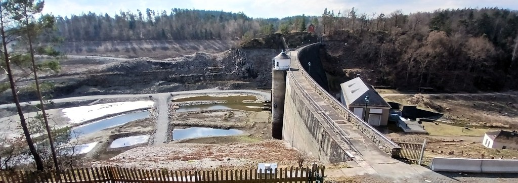 Für diese fuhren wir über Steitz (Auma-Weidatal) zum Wanderparkplatz an der Bermichsmühle, von wo aus ein ganz gut ausgeschilderter „Bauzeitlicher Rundwanderweg“ zur Haupt-Staumauer führt. Hier bietet eine extra neu errichtete Aussichtsplattform eine gute Perspektive über die Dammkrone und den freigelegt Grund der Talsperre.