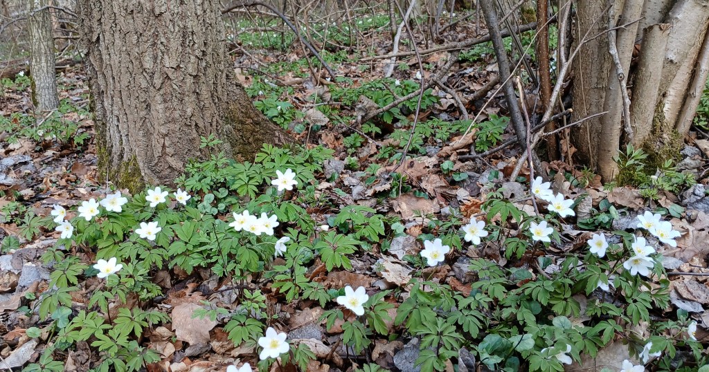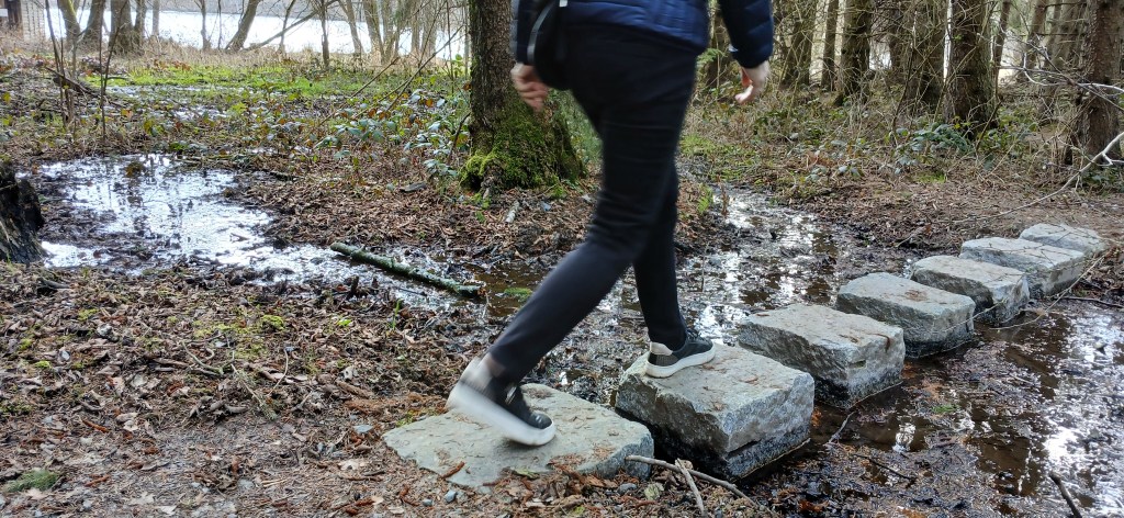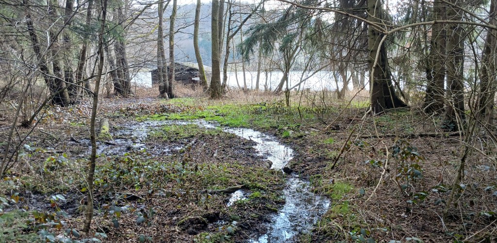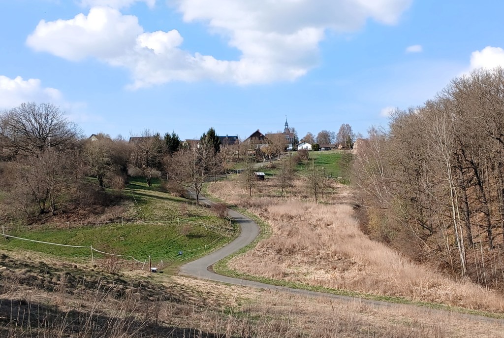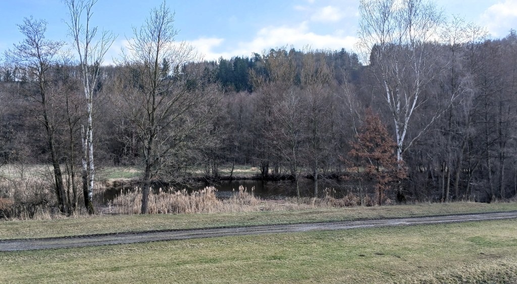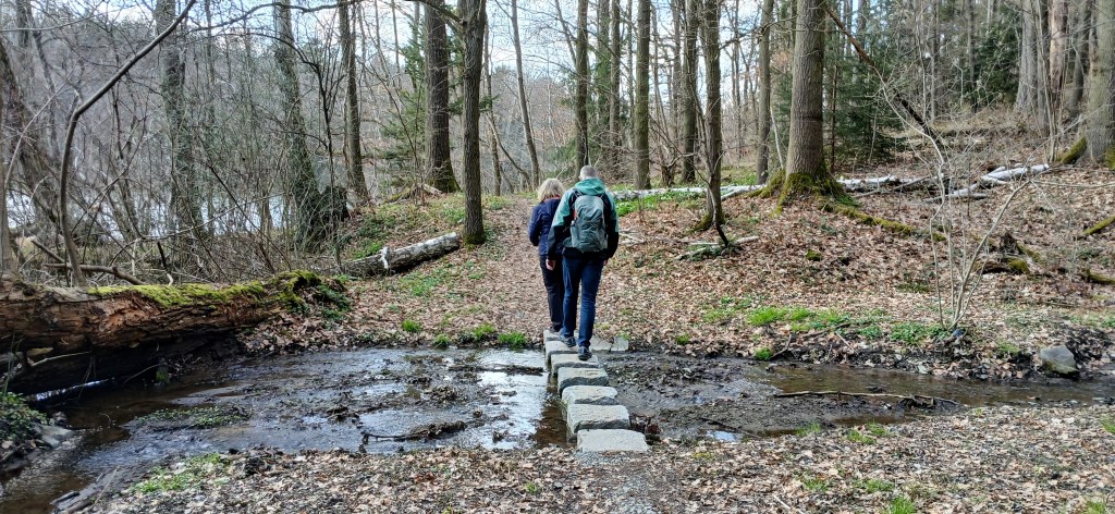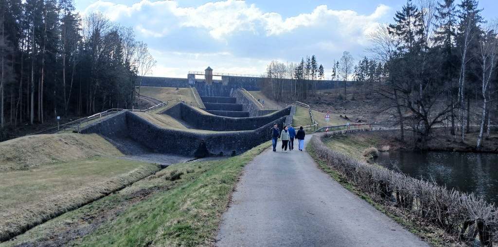 Von diesem Aussichtspunkt führt der Weg weiter zur nächsten Aussichtsplattform an der sogenannten Sattelmauer. Hier steht man vor der Entscheidung, ob man den Talsperrenweg Richtung Dörtendorf folgt, dem Bauzeitlichen Rundweg zurück oder dem offiziellen Rundweg um das Ausgleichsbecken. Wir entschieden uns für letztere Variante. Auf dem Weg zum Ausgleichsbecken bietet ein Abzweig den Spaziergang zum Aussichtspunkt Grobisch an. Dieser soll mit seiner schönen Aussicht durchaus empfehlenswert sein. Doch wir gingen weiter, um nördlich um das Ausgleichsbecken über kleine Zuflüsse hinweg und an blühenden Buschwindröschen vorbei zurück zum Wanderparkplatz an der Bermichsmühle zu kommen. Unterwegs wurden wir durch schöne Ausblicke über das Ausgleichsbecken und nach Staitz belohnt.