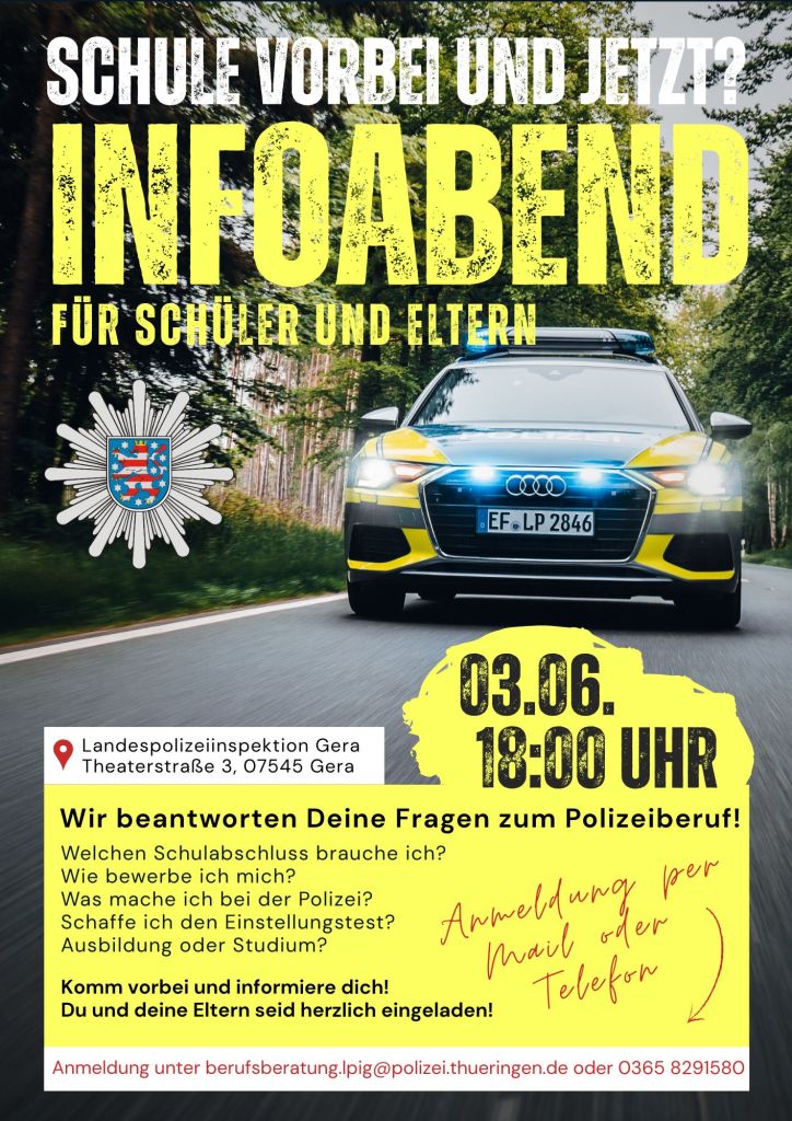 Gera (ots). Die Landespolizeiinspektion Gera lädt am 3. Juni um 18 Uhr zu einem Informationsabend für interessierte Schülerinnen und Schüler ein. Im Mittelpunkt der Veranstaltung stehen der Polizeiberuf sowie der Bewerbungsprozess bei der Thüringer Polizei. Während der Veranstaltung erhalten die Teilnehmenden umfassende Einblicke in die vielseitigen Aufgaben im Polizeidienst sowie die Voraussetzungen und Abläufe einer erfolgreichen Bewerbung. Der Infoabend richtet sich an Schülerinnen und Schüler, die sich für den Polizeiberuf interessieren. Auch Eltern, die ihr Kind bei der Berufsorientierung unterstützen möchten, sind herzlich eingeladen. Eine gemeinsame Teilnahme ist ausdrücklich erwünscht.