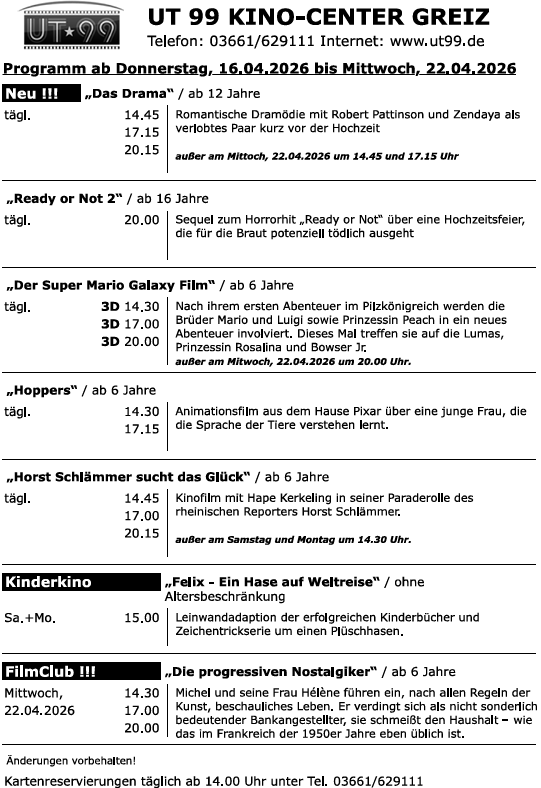 „Das Drama“ ist neu im Programm, es gibt einen speziellen Kinderkino-Film mit einem Hasen und am kommenden Mittwoch zeigt der FilmClub einen progressiven Nostalgiker. Zudem läuft der „Super Mario Galaxy Film“ weiterhin in Digital 3D. Das Greizer UT 99 zeigt insgesamt sieben Filme – von Horror über Science Fiction bis hin zur Pixar-Animation. Und auch Horst Schlemmer ist noch dabei!