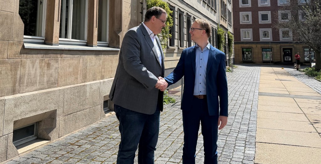 Anlässlich seines Amtsantrittes am 1. April 2026 als neuer Leiter des Standortes Gera der Deutschen Rentenversicherung Bund heißt Oberbürgermeister Kurt Dannenberg Felix Baumeier in Gera herzlich willkommen. Zuvor war Baumeier Leiter des kommunalen Jobcenter im Landkreis Leipzig und war für die strategische Weiterentwicklung der Organisation verantwortlich. Jetzt löst er Thomas Hubensteiner in den Ruhestand ab, der bisher Leiter des Standortes Gera war.