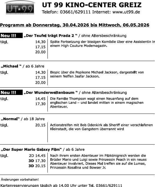 Der Michael-Jackson-Film „Michael“ lockt genauso ins Greizer UT 99 wie zwei neue Filme im Programm – „Der Teufel trägt Prada 2“ und „Der Wunderweltenbaum“. Also dürfte für jedes Alter und (fast) jedes Interesse etwas dabei sein.